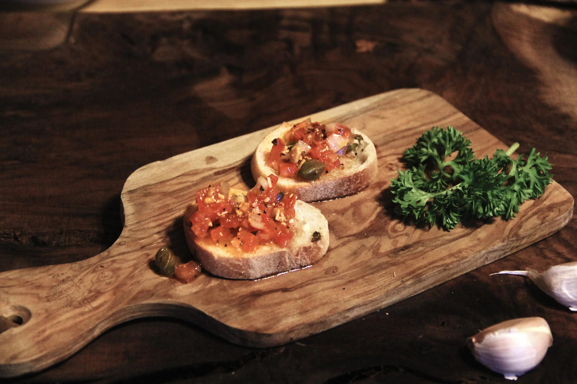 2 parties bruschetta, 1 partie trempette “Stinger” de Fernando. Mélanger et déguster!