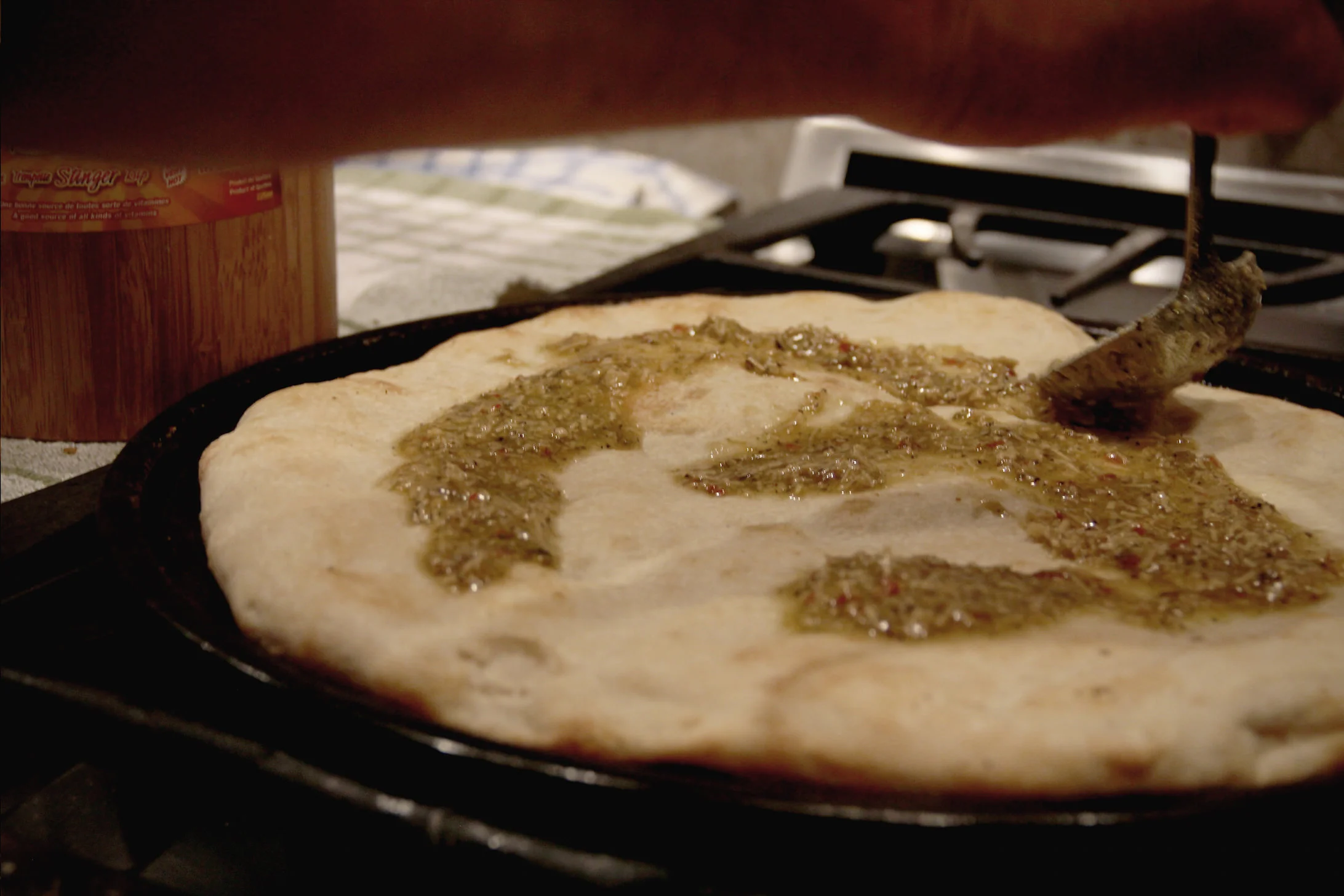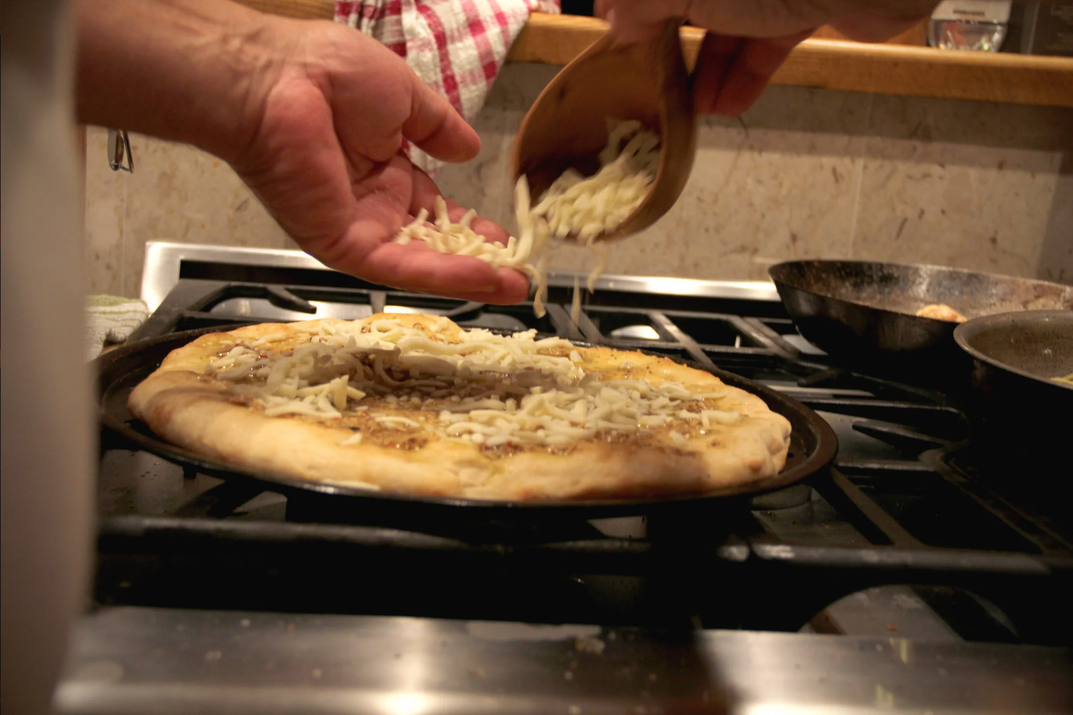Retiriez du four et répandre la pâte uniformément avec la Trempette « Stinger » de Fernando. Saupoudrer la quantité désirée de fromage mozzarella et revenir au four pendant 12 minutes de plus.