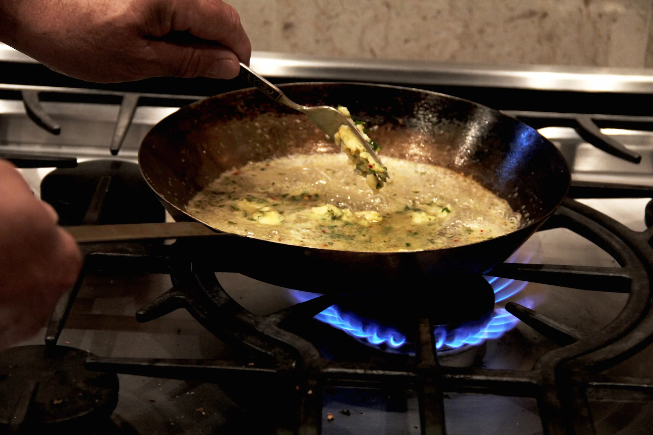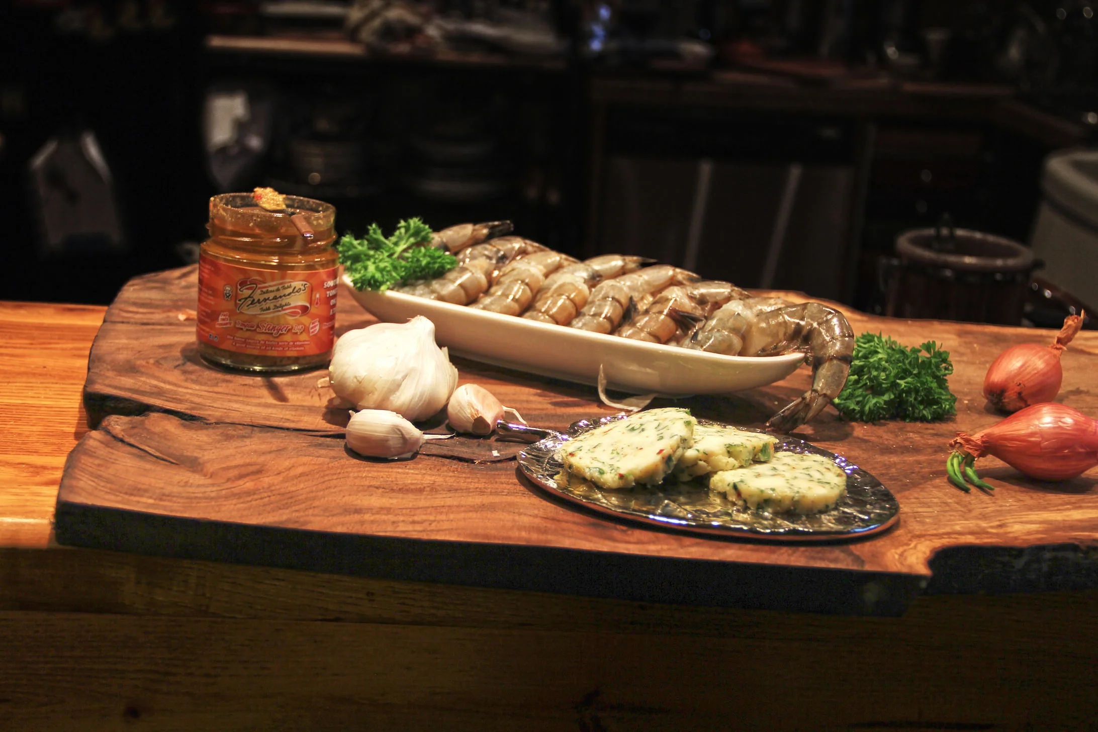 Dans une poêle faire chauffer le beurre a l’ail. Ajouter les crevettes et faire cuire 30 seconds de chaque cote. Jeter la Trempette « Stinger » de Fernando dans la poêle et faire cuire encore un autre 30 secondes de chaque cote. Placez-les sur un plat de service et arroser avec le jus de la poêle.